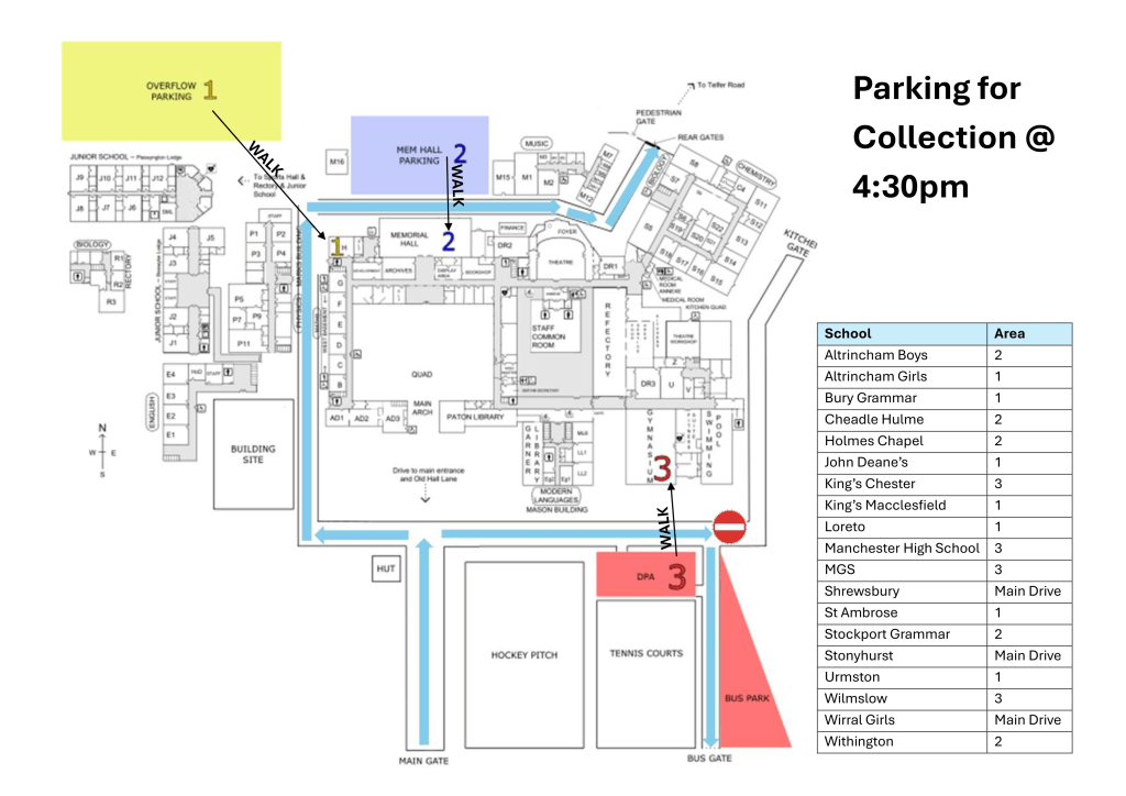 Each school has been assigned to one of three parking and waiting areas. On arrival, parents should follow the signs to your designated parking area, and walk to the corresponding waiting area. Delegates will be taken there by the school prefects to meet them.